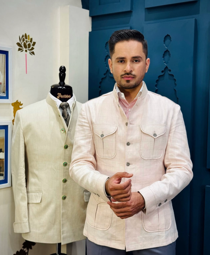 A pastel pink Bushcoat with subtle white checks, balancing crisp structure with a soft, elegant palette. Perfect for spring and summer events.