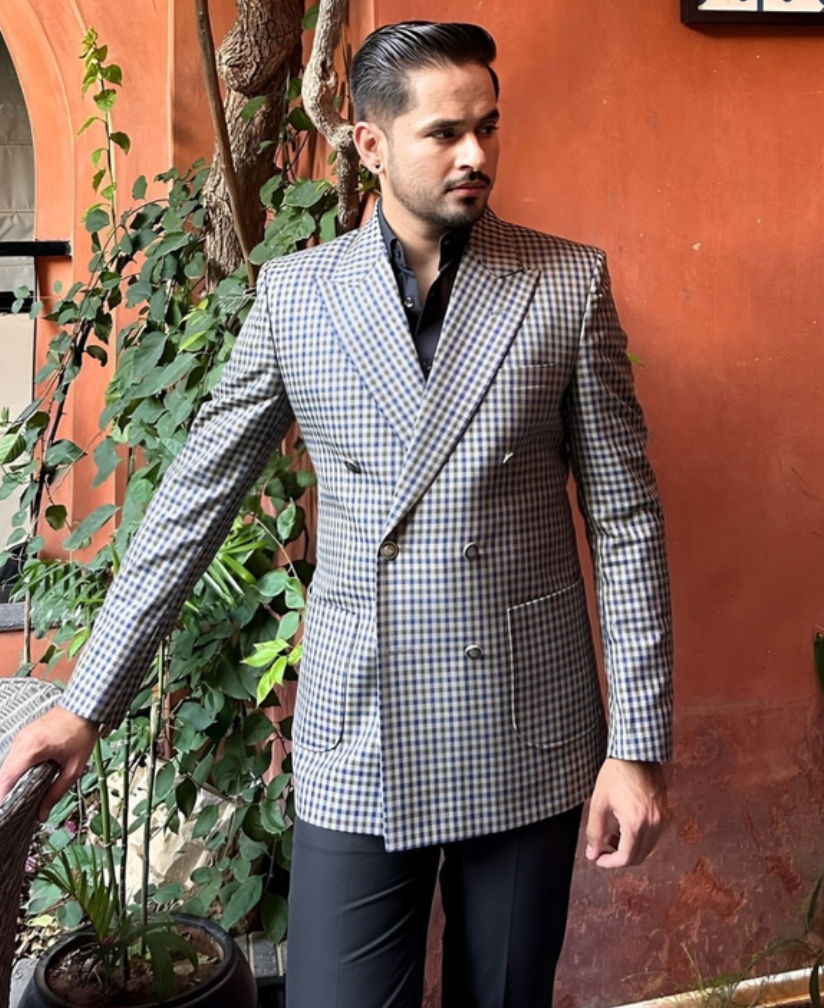 A bold double-breasted blazer in grey and blue checks. Strong tailoring meets striking patterns, making it a standout for high-profile occasions.