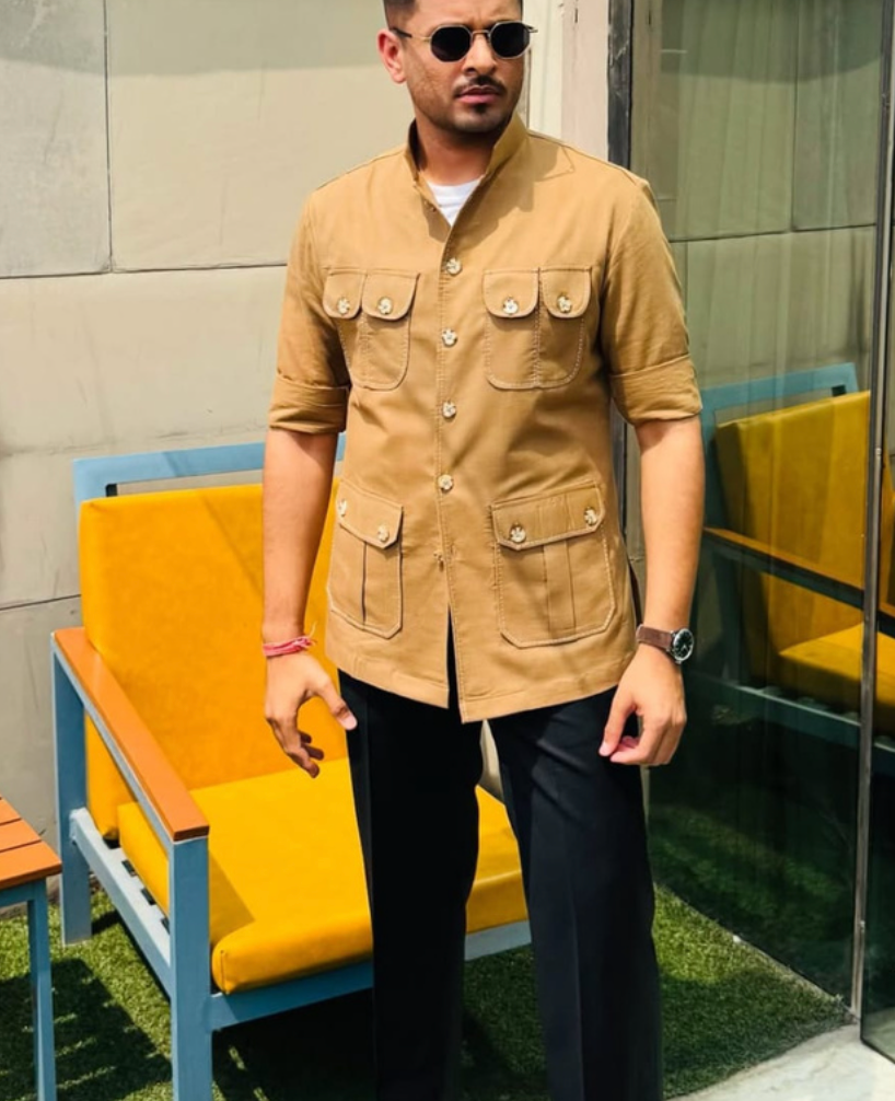 In a rich camel brown, this cigar pocket shirt channels rugged elegance. Gold-tone buttons and four symmetrical pockets create a confident, classic look.
