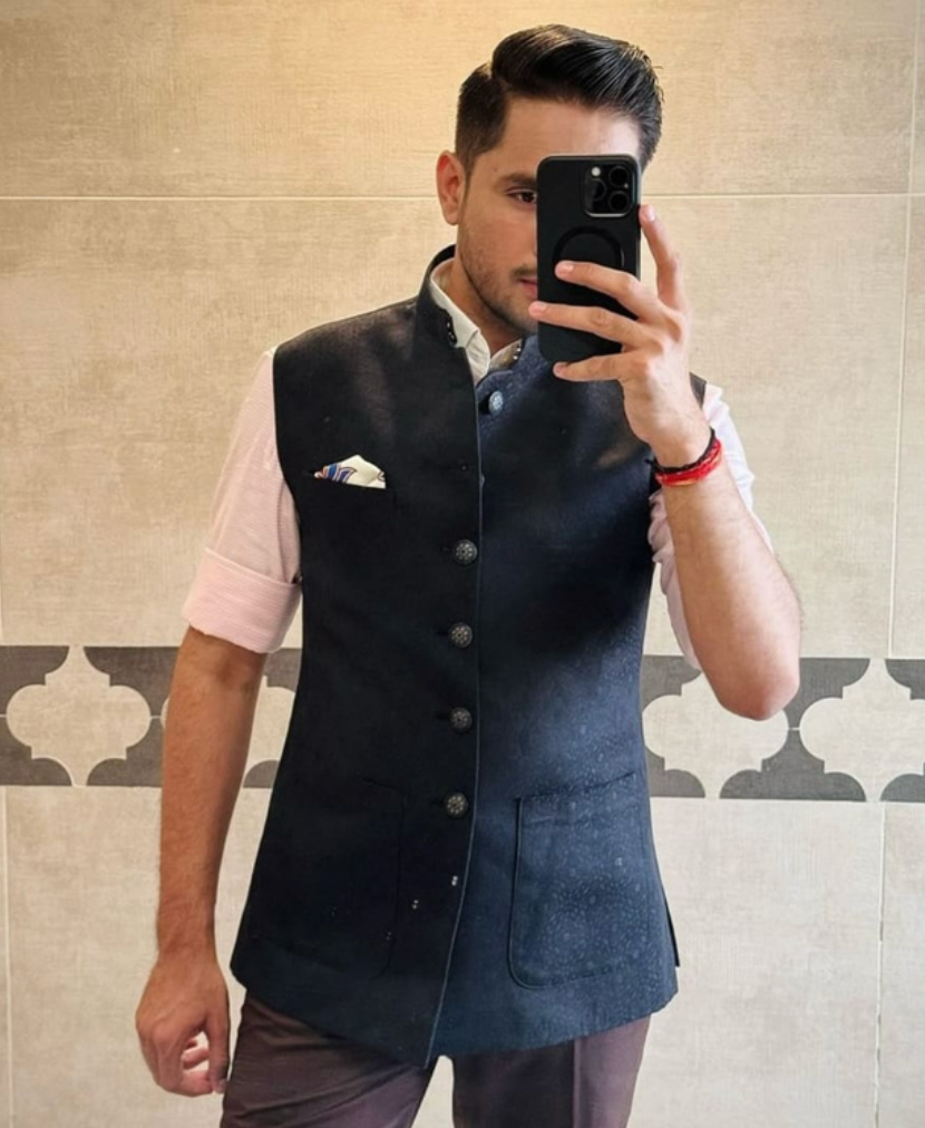 A sleek black linen half jacket with a subtle textured finish. Minimal yet powerful, it’s a go-to choice for refined evening dressing.