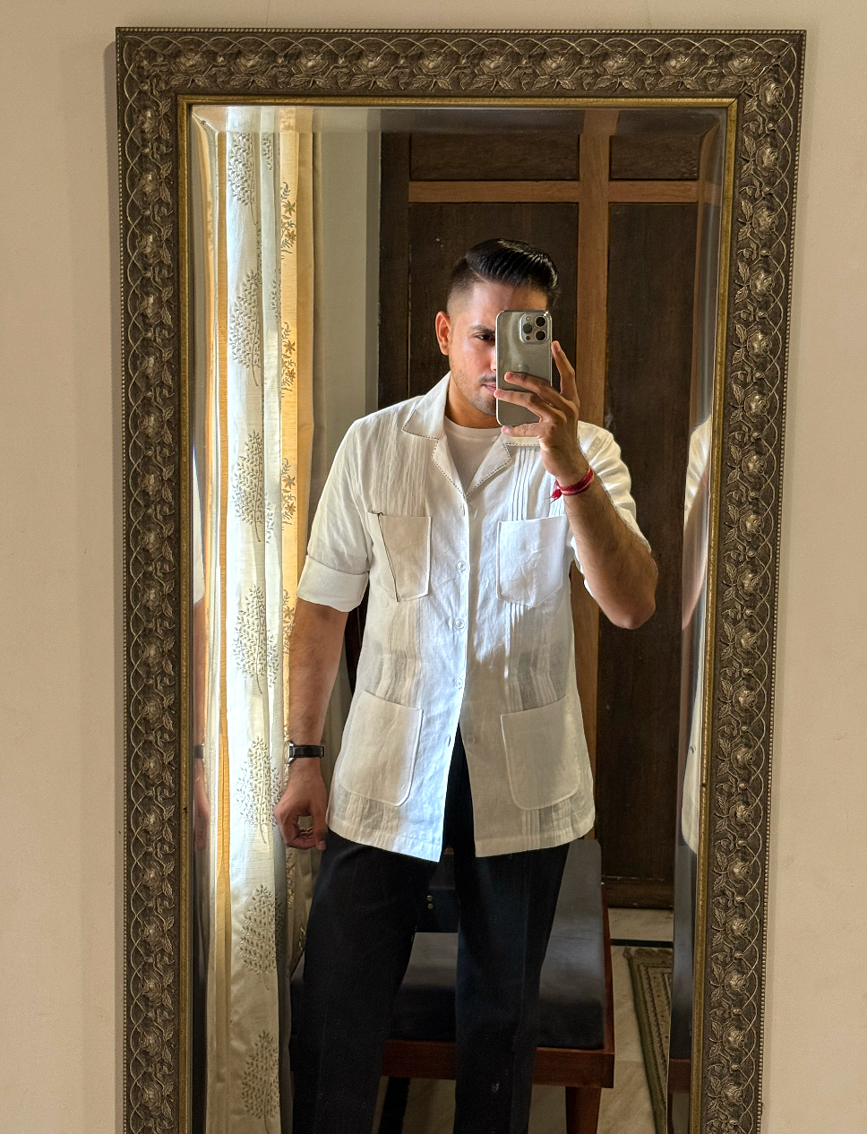 Crafted in breathable linen, this shirt features pleated heritage-style detailing, four functional pockets, and a classic hunting back. Perfect for a casual, effortless look, it pairs beautifully with jeans for those relaxed, stylish days.
